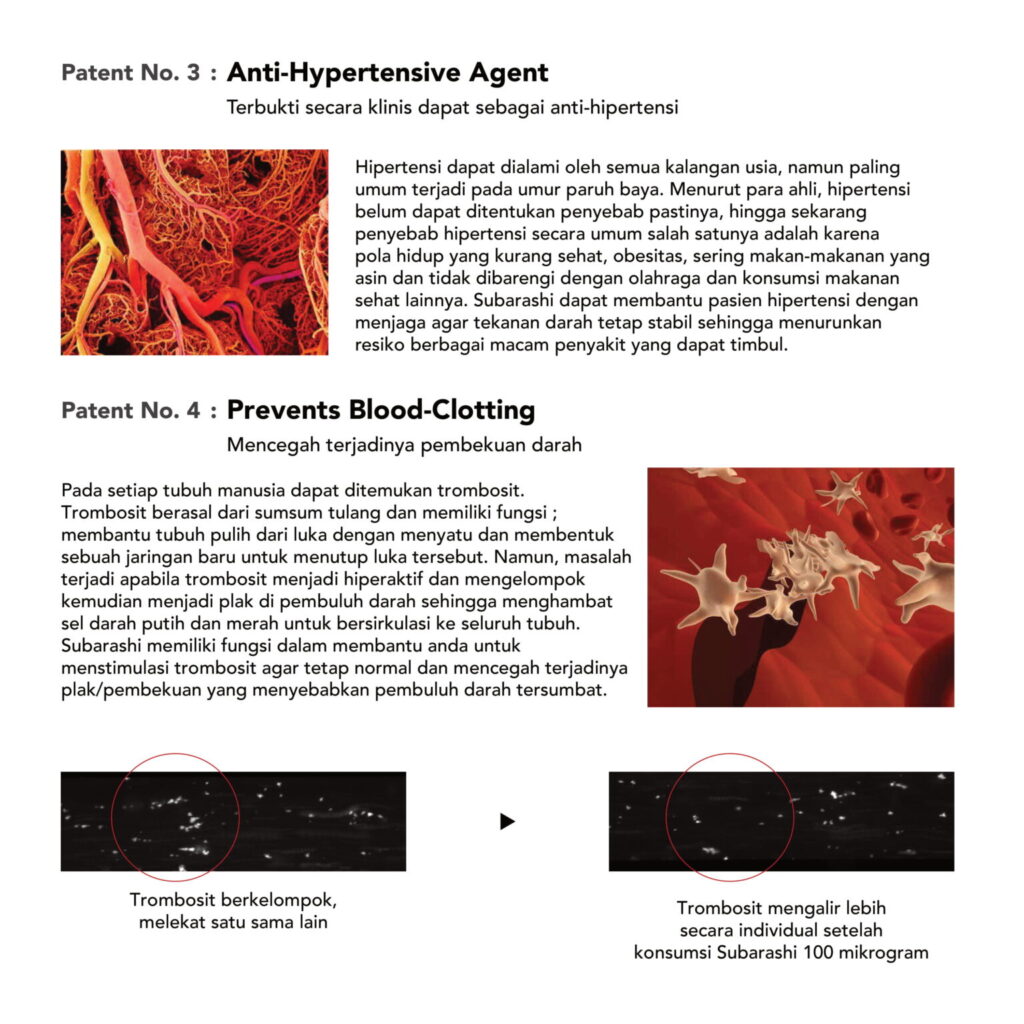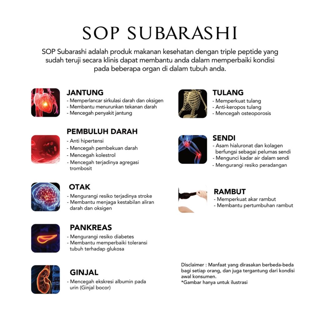 Diolah dan diproses dengan teknologi terkini Jepang sehingga menghasilkan peptida nano size 600 Dalton sehingga mudah diserap dan berfungsi maksimal dalam tubuh manusia. SOP Subarashi memiliki 8 paten manfaat, seperti yang tertera pada gambar di bawah ini :